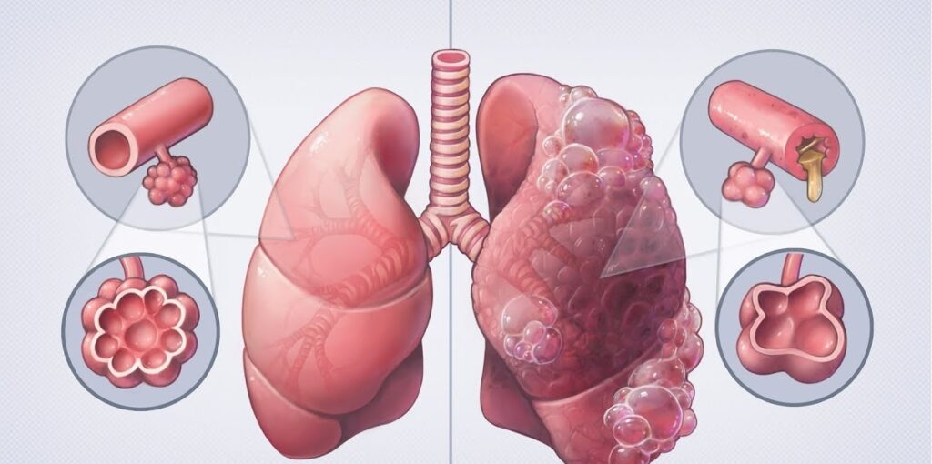 Os alvéolos (pequenas bolsas de ar dentro dos pulmôes) perdem elasticidade e se rompem. Isso faz com que a troca de oxigênio seja prejudicada, deixando a respiração cansativa e o corpo sem energia.